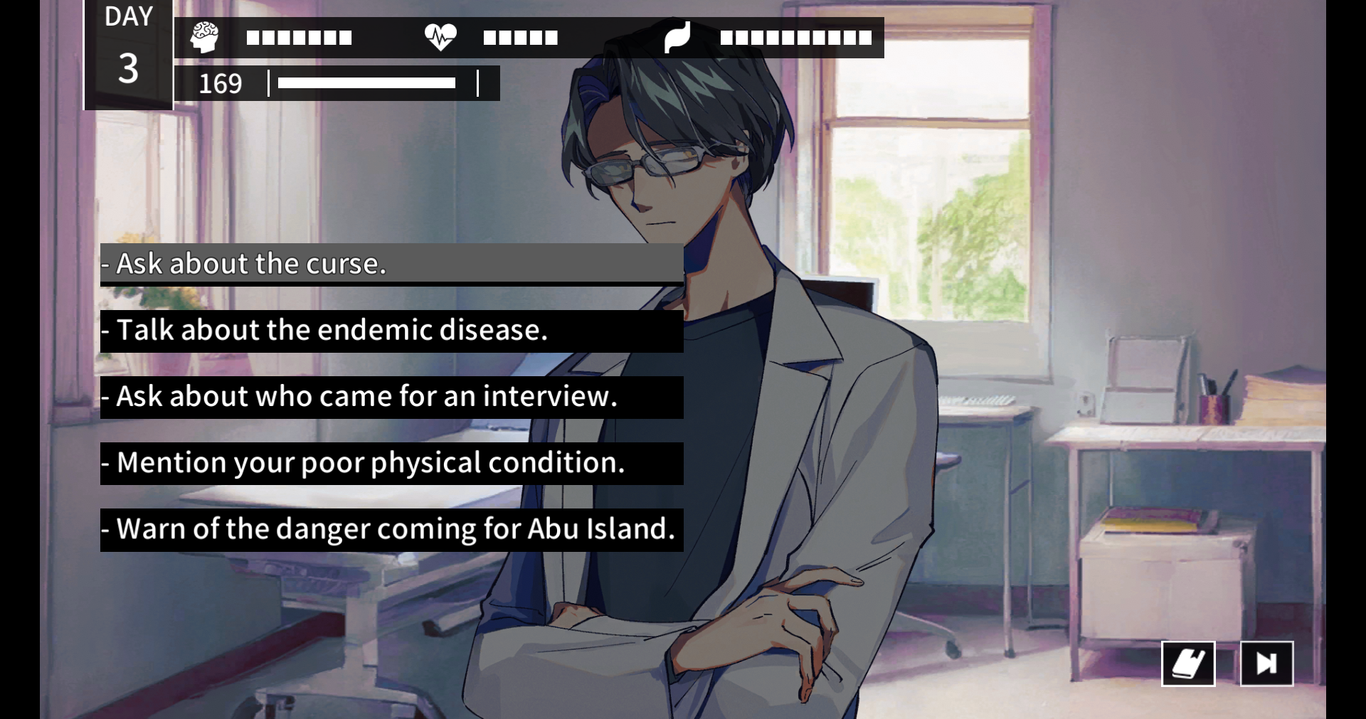 島を探索して空腹になっていくと、呪いの作用で恐ろしい発作が発生したり、ダイスロール成功率が低下したりします。