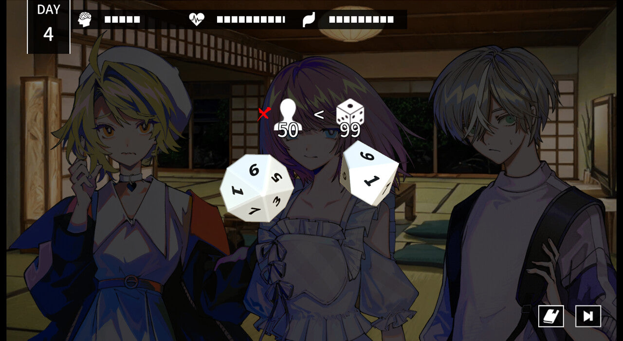 重要な場面では選択肢の成否がダイスロールによって決まります。成功率は主人公や仲間の能力値に応じます。時には制限時間の中で成功を迫られる、危機的場面も。