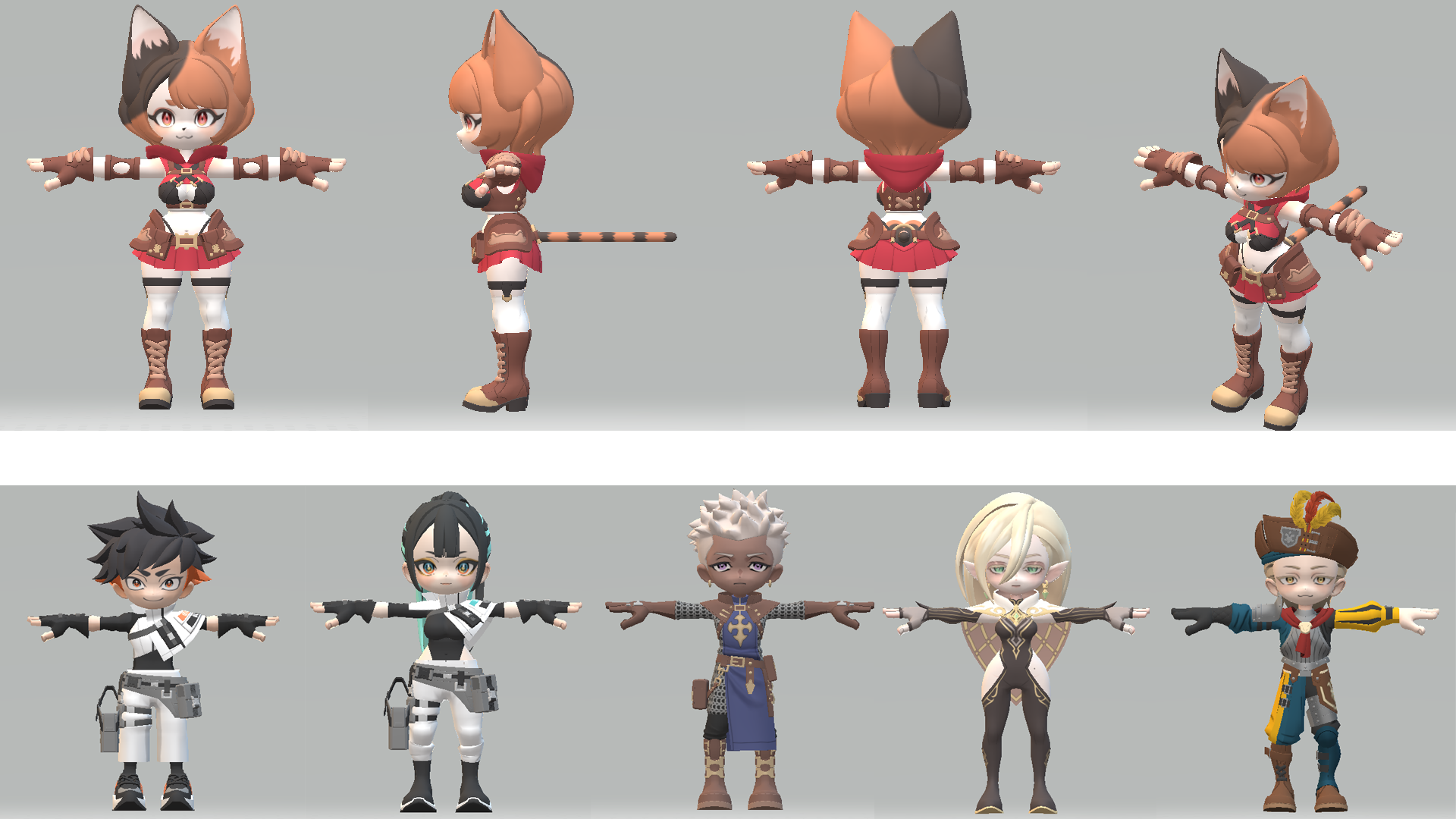 イラストレーター「撃鉄」の描く、メインキャラクター「虚太郎」「美空」「メグ」「アラン」「テリー」「ルーリエ」の6名の表情差分付きの立ち絵イラスト。FBX形式の3Dモデルとアニメーション。そして彼らの持つ4種類の武器の3Dモデルがセットになった『ISKEAI CREATORS』の公式アセットです。