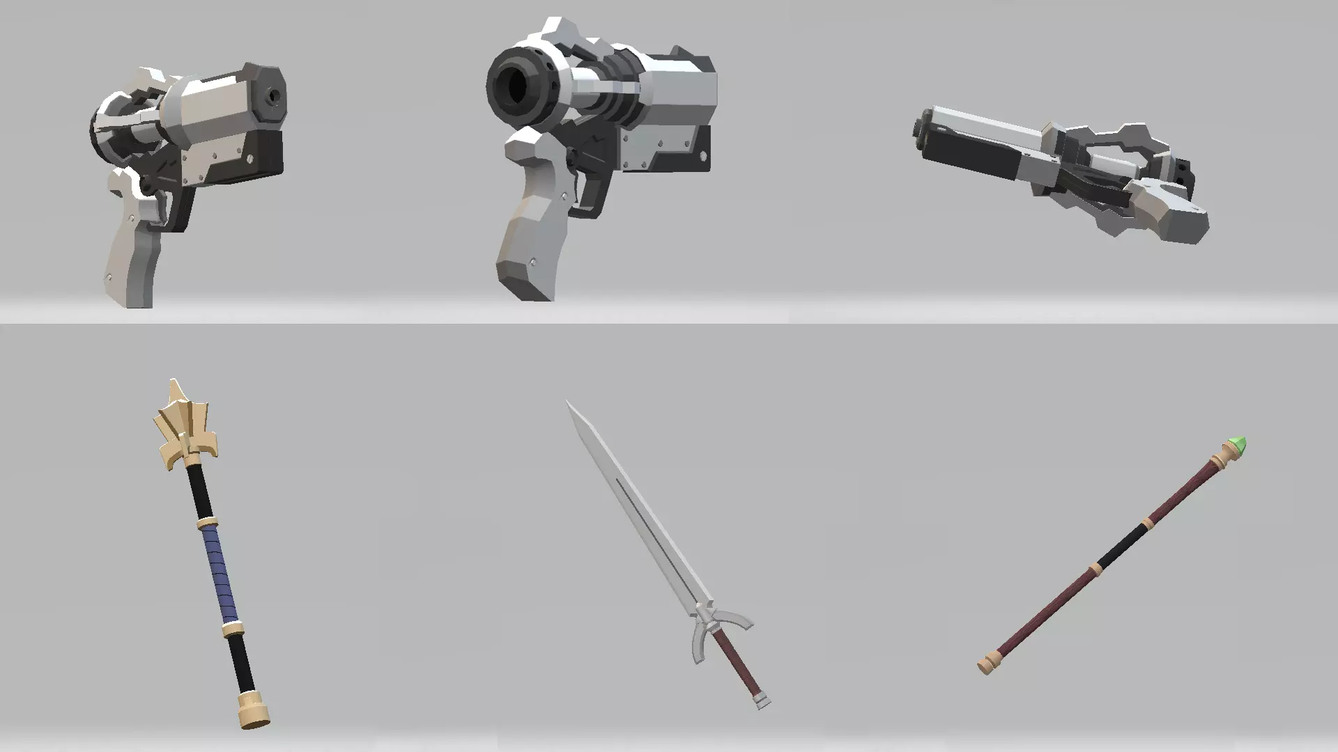 そして彼らの持つ4種類の武器の3Dモデルがセットになったアセットです。
