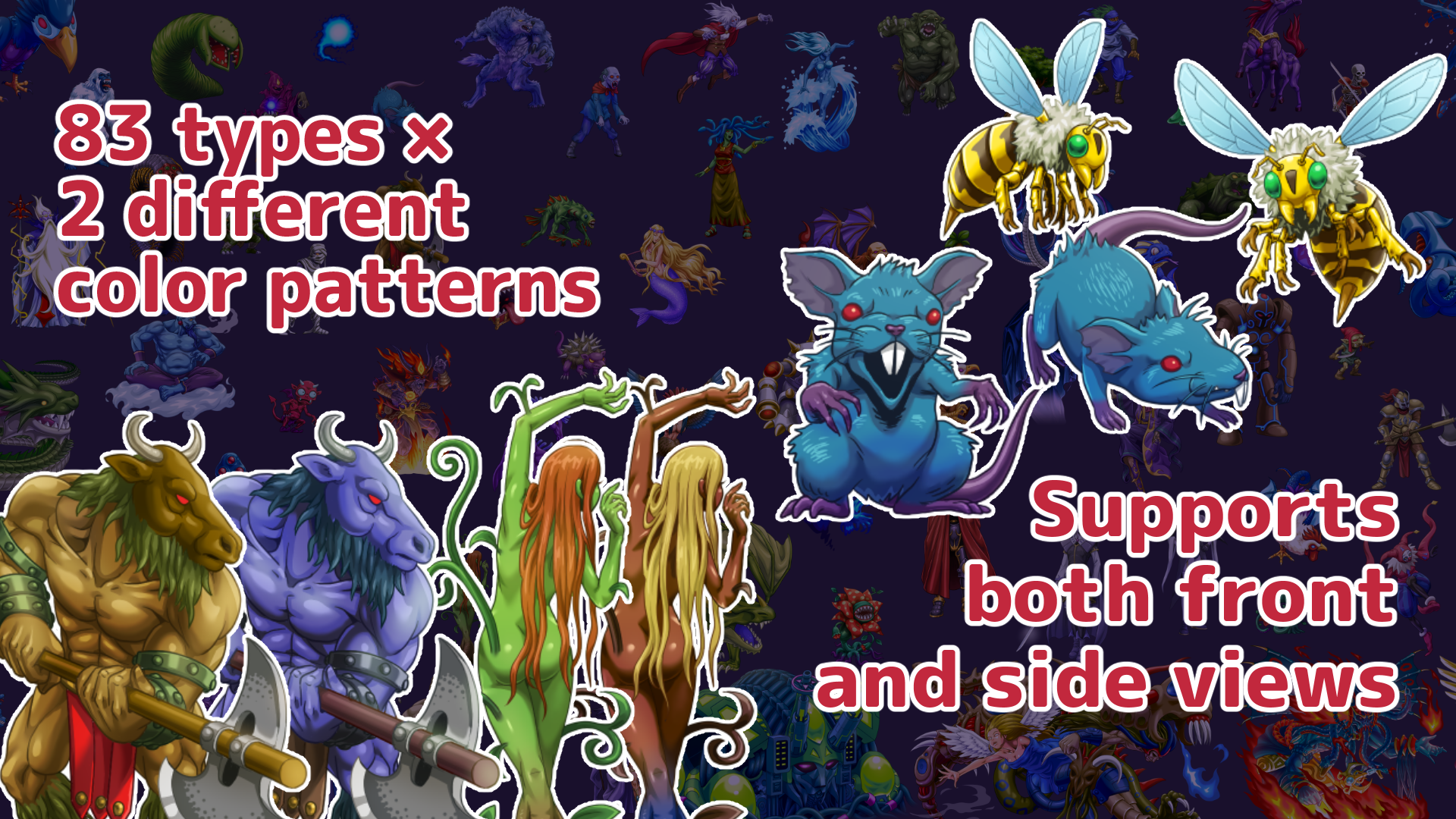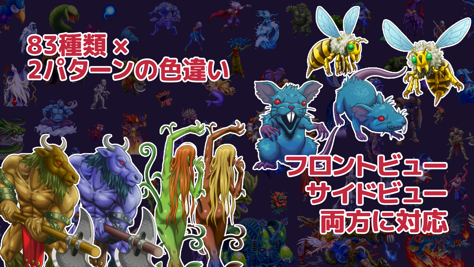 フロントビュー、サイドビューで大きさや向きを調整。また、それぞれ全く別のグラフィックを描き起こしたものも多数あります。それぞれのモンスターは2パターンの色違いがあります。地面影のありバージョン、なしバージョンを選べます。
