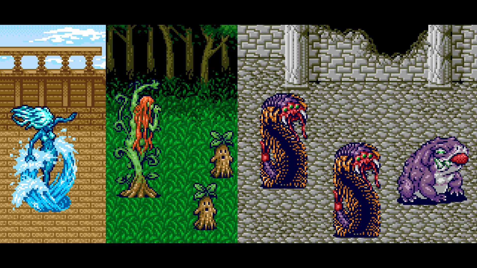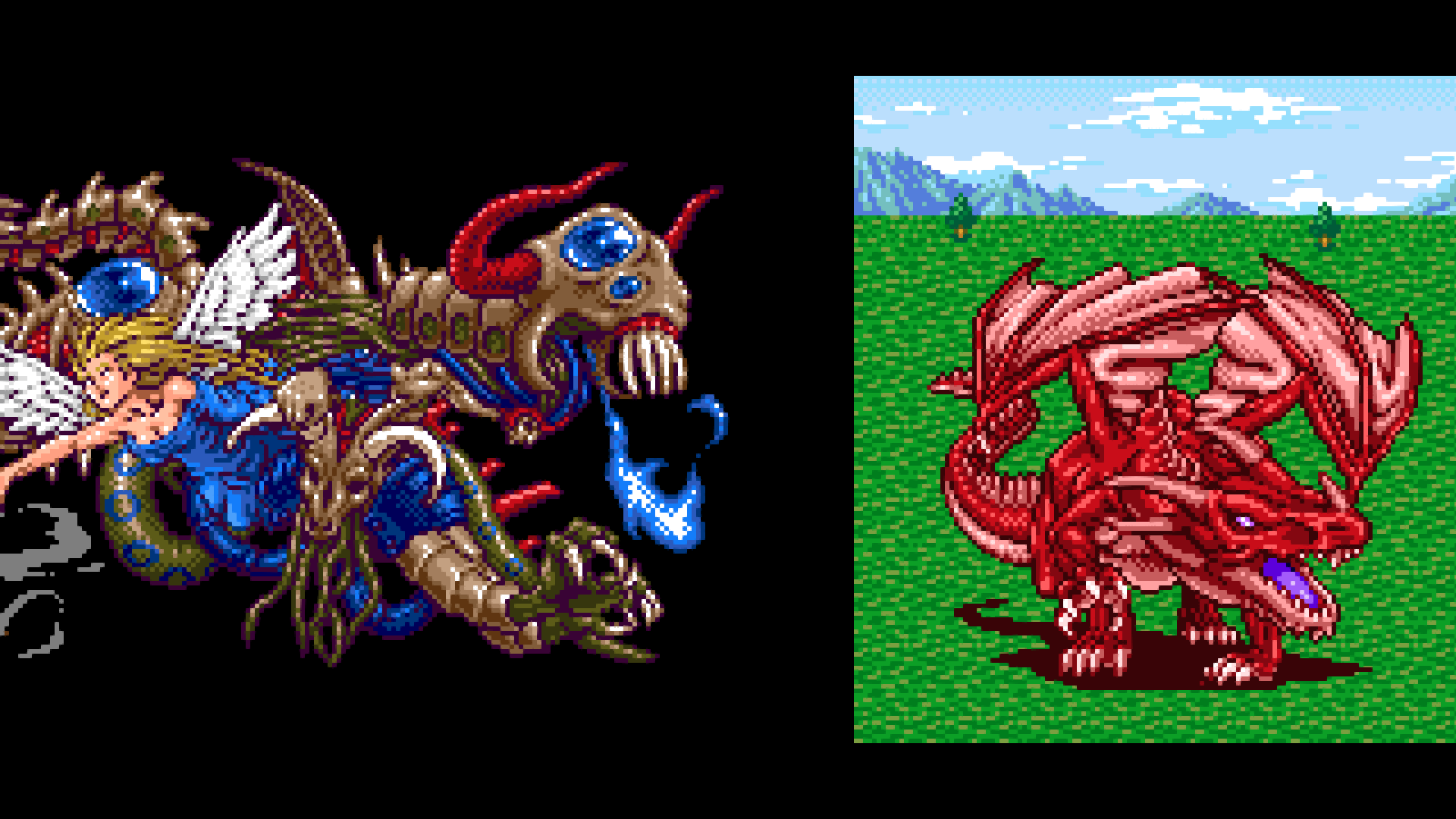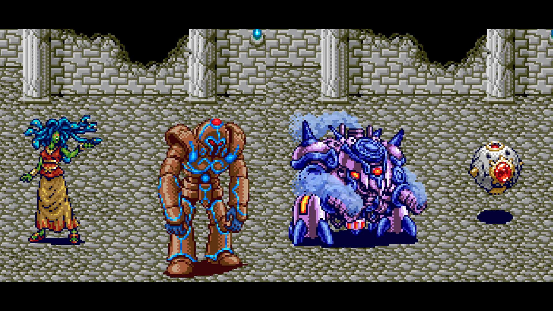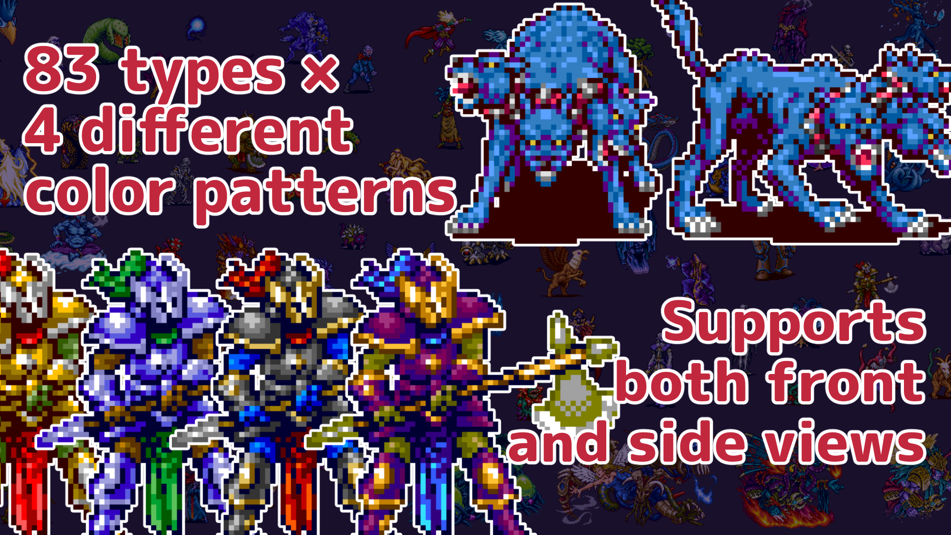往年の家庭用16bitゲーム機などで使われていた「9bitカラー」512色のみを使って、1パレット15色という単位で配色を行うという制限の元で作られたエネミー素材集です。