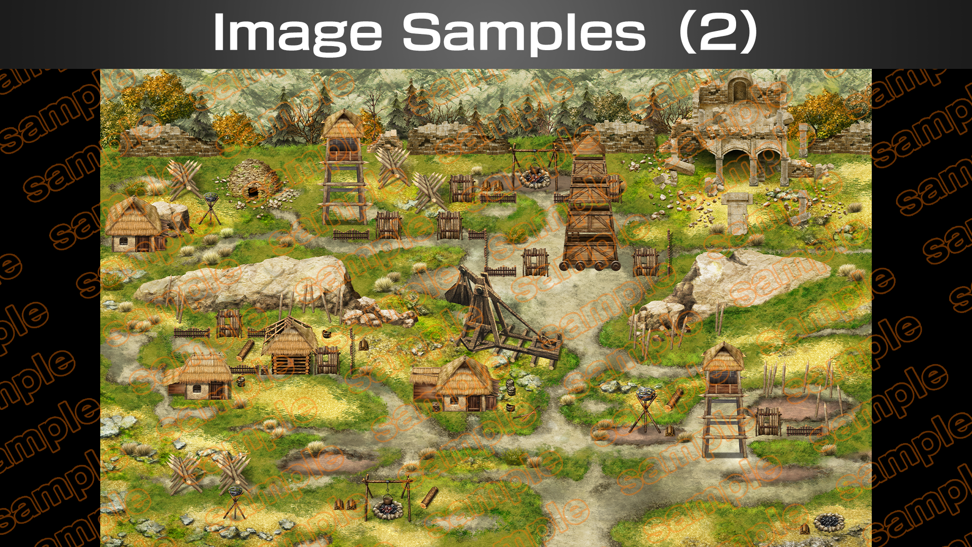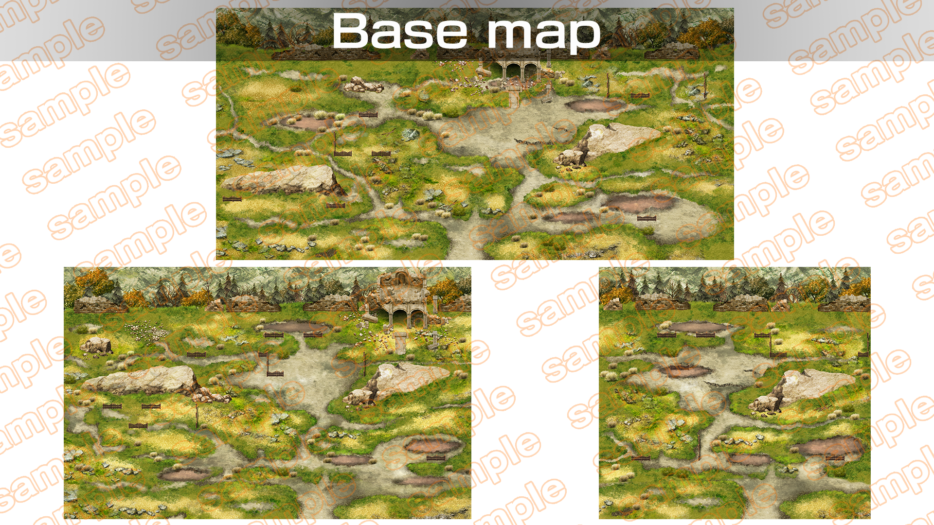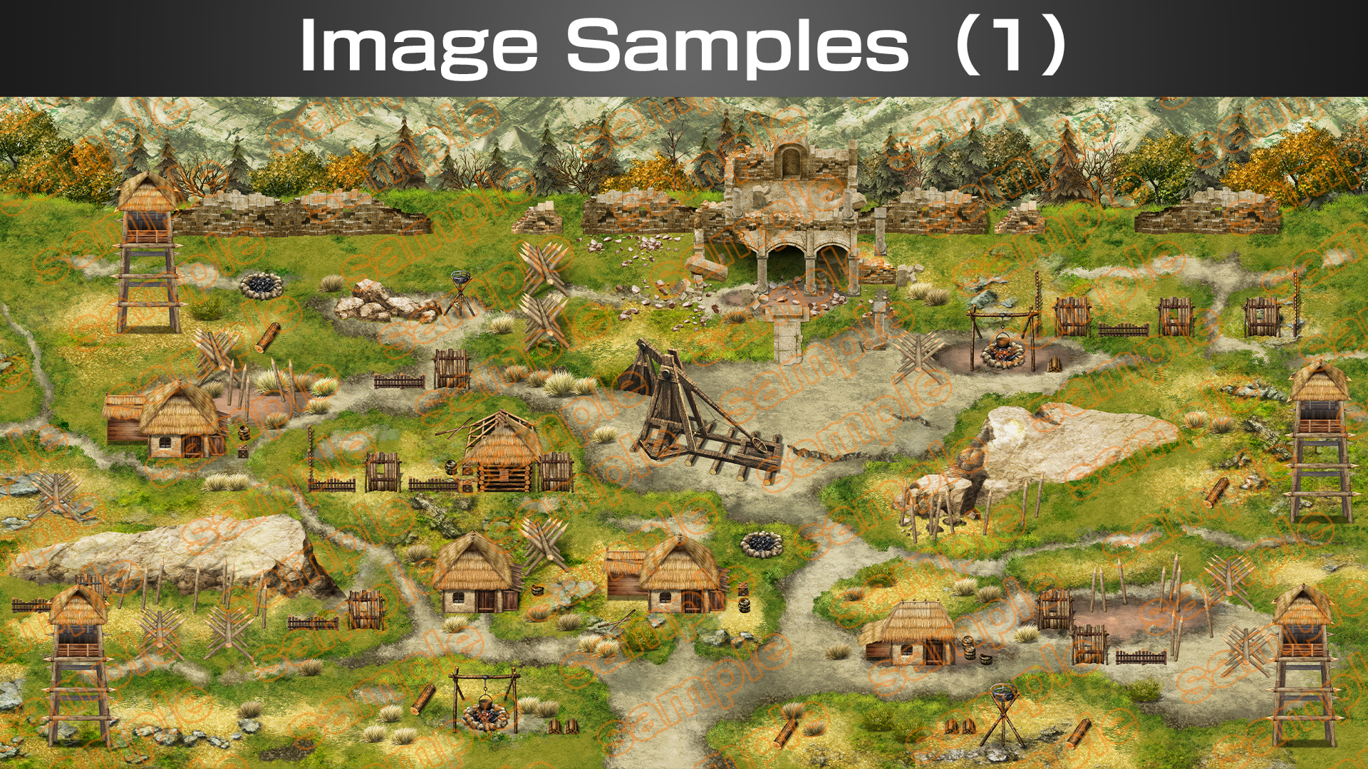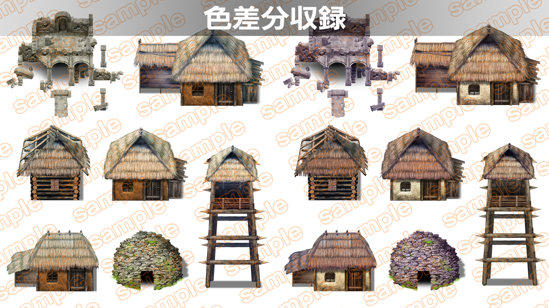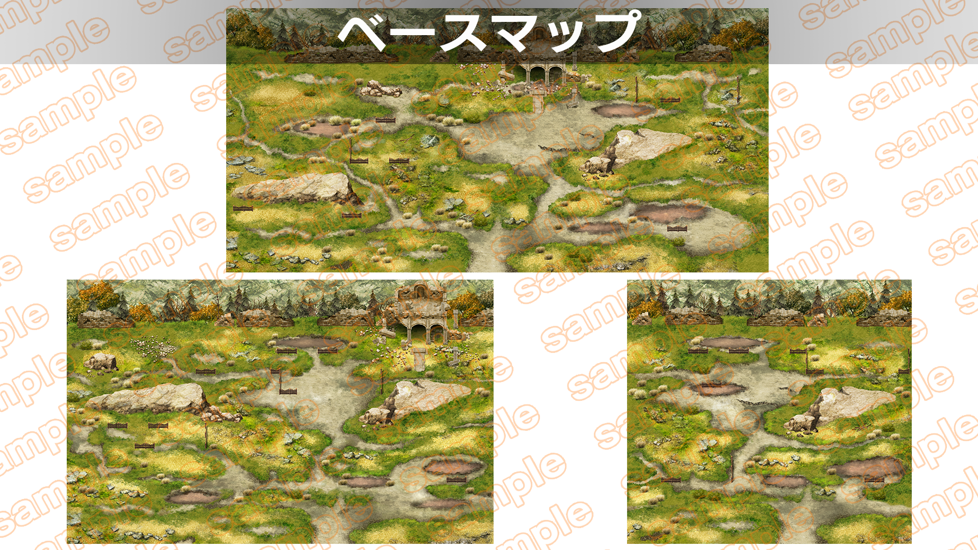 前線の基地や、かつて戦場となって寂れた村風のマップを収録しており、ゲームテンプレートはもちろん、オリジナルゲームでもご活用いただけます。