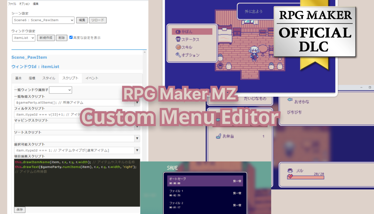 Custom Menu Editor is an external editor for RPG Maker MZ that allows you to create custom menus and UI.