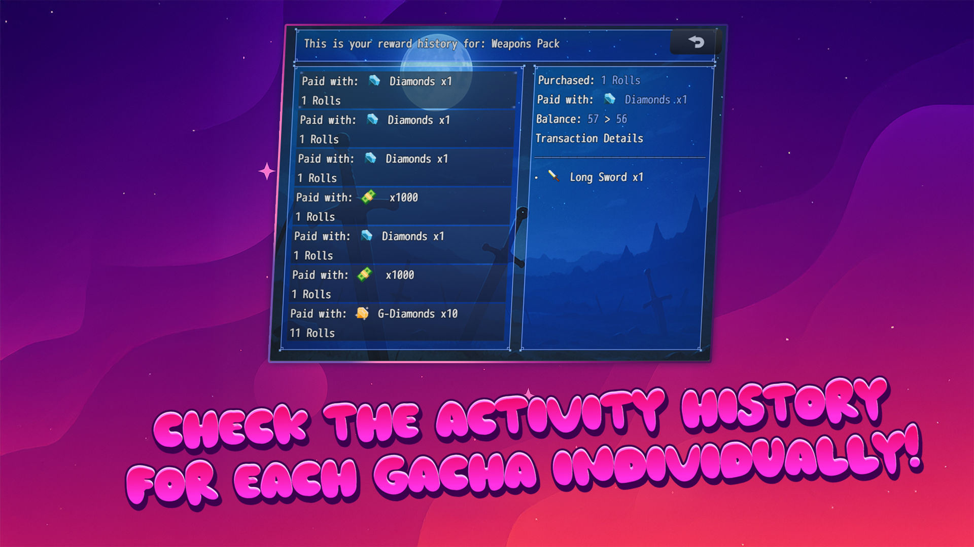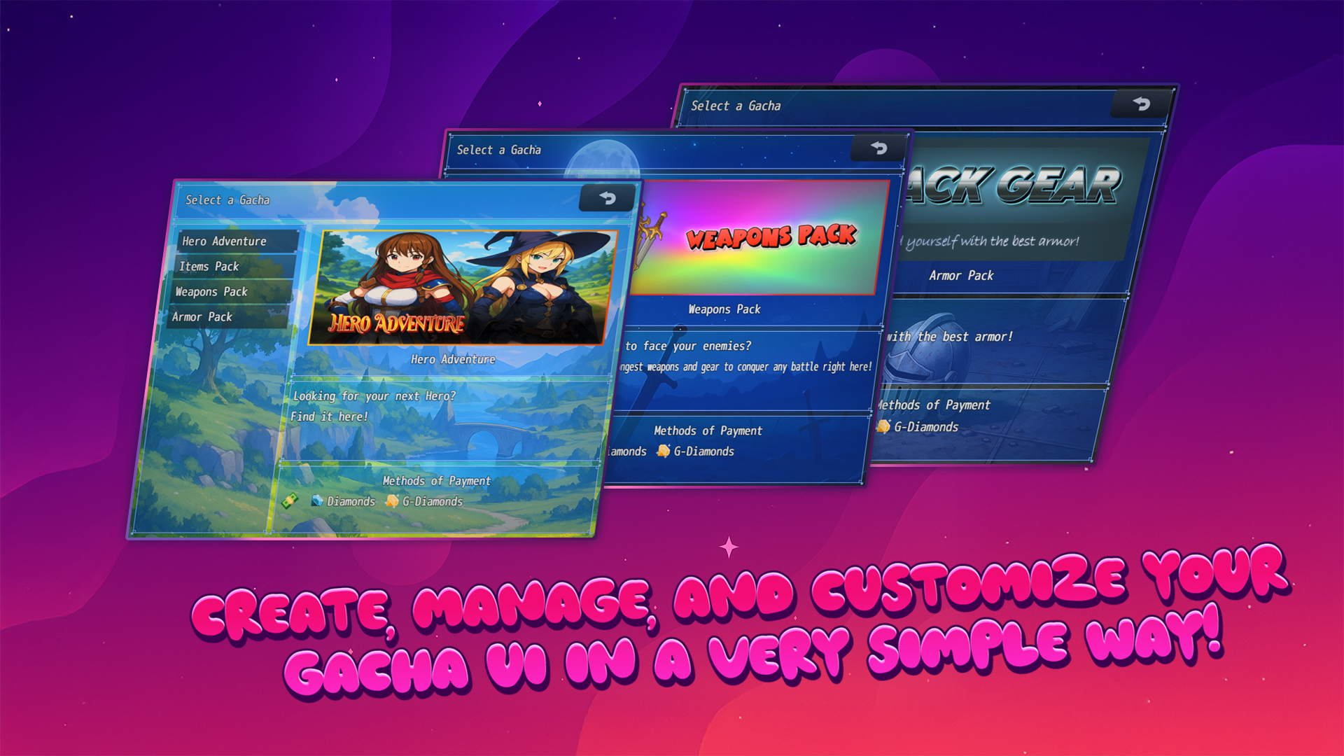 - Customizable Gacha Banners: Define your own banners with item pools, rarity tiers, and drop rates.