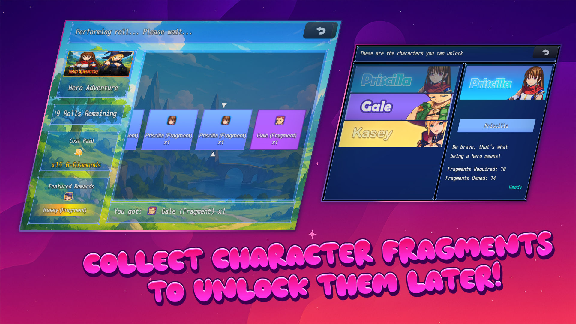 - Fragment System: Unlock characters by collecting fragments from the gacha.